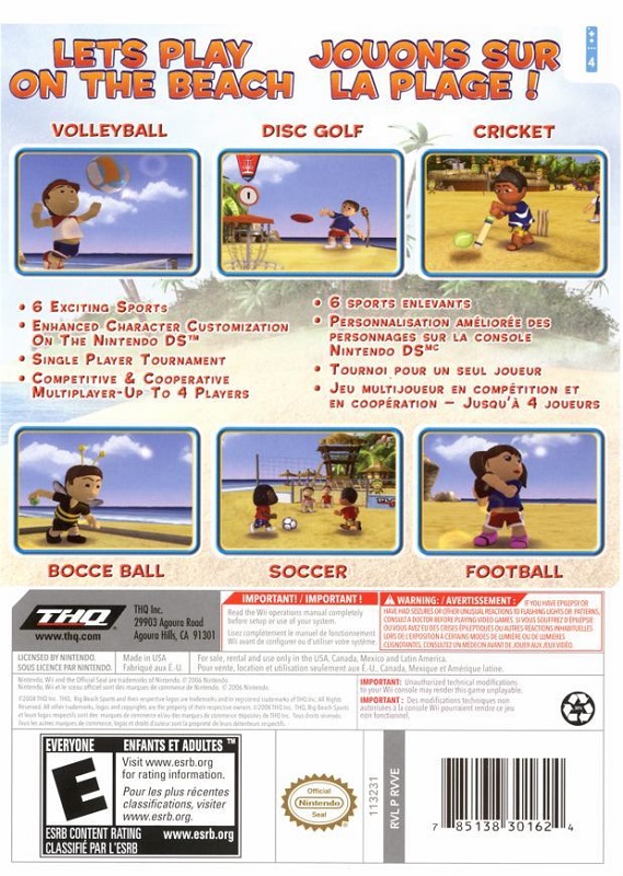 Благодаря задействованию всех возможностей революционного управления Nintendo Wii и поддержке многопользовательского режима на четверых вы с головой погрузитесь в эту великолепную игру. Расслабьтесь и получите удовольствие. Big Beach Sports станет гарантом вашего позитивного настроения!