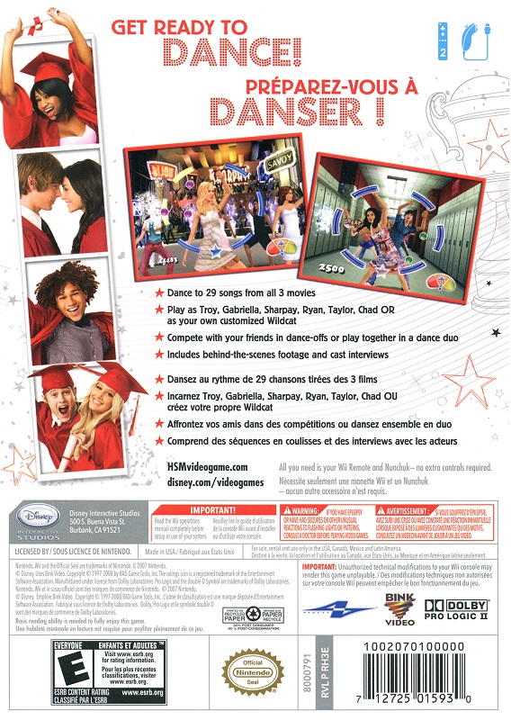 Для исследования доступно все, что вы видели и слышали в кинотрилогии High School Musical - ходите в школу Ист-Хай, слушайте песни из всех трех фильмов и танцуйте под них: инновационные контроллеры Wii - пульт и Нунчак - помогут вам в этом! Попробуйте соревновательный многопользовательский режим - зарабатывайте бонусы, чтобы влиять на выступления конкурента! Или объединитесь в кооперативном многопользовательском режиме - танцуйте синхронно, чтобы заработать максимум призовых очков и открыть новых персонажей, новые наряды и новые песни!